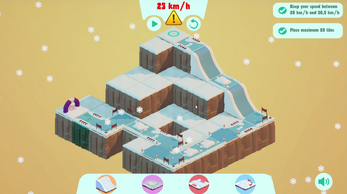 Each mountain is a puzzle waiting to be shaped. Place terrain pieces, carve paths through the snow, and experiment freely to create ski runs that are both beautiful and fun to ride.